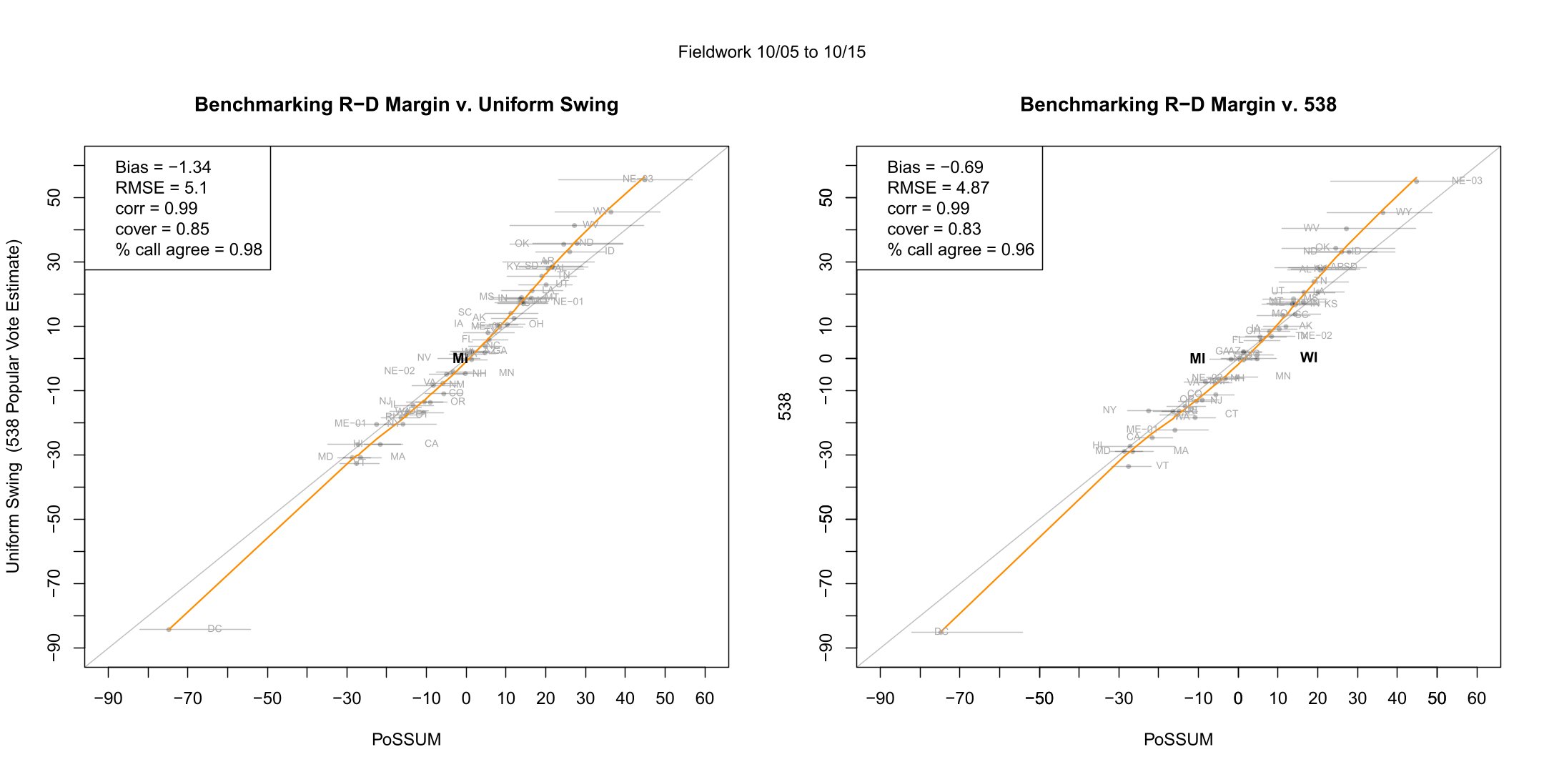 In terms of direct comparison with Uniform Swing and the 538 models, again PoSSUM traces both quite closely, departing in calls with Uniform Swing only in MI, and with 538 in MI and WI. Note the story in Wisconsin is again driven by third-party performance.