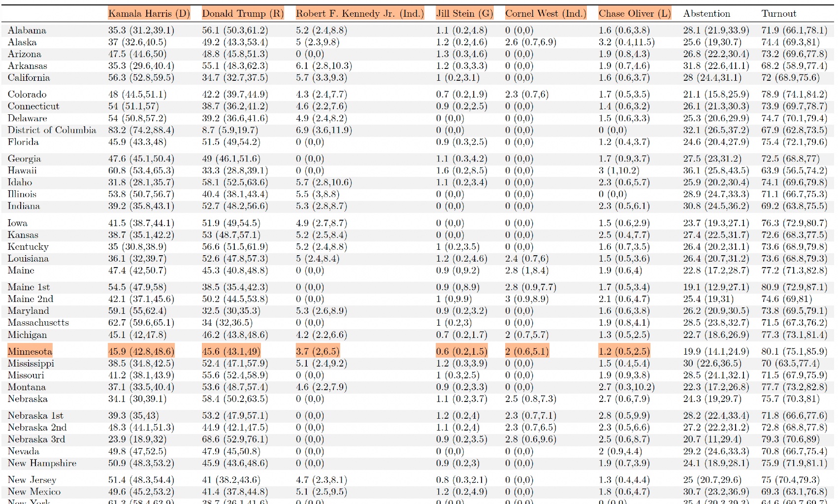 Minnesota is a point of departure for PoSSUM relative to other polls due to strong performance of third party candidates. As mentioned in the previous forecast, it’s difficult to say whether this is true on the ground, the AI hallucinating, or selection effects into X. The AI’s read is consistent with the Trump-Kennedy strategy of selective withdrawal.